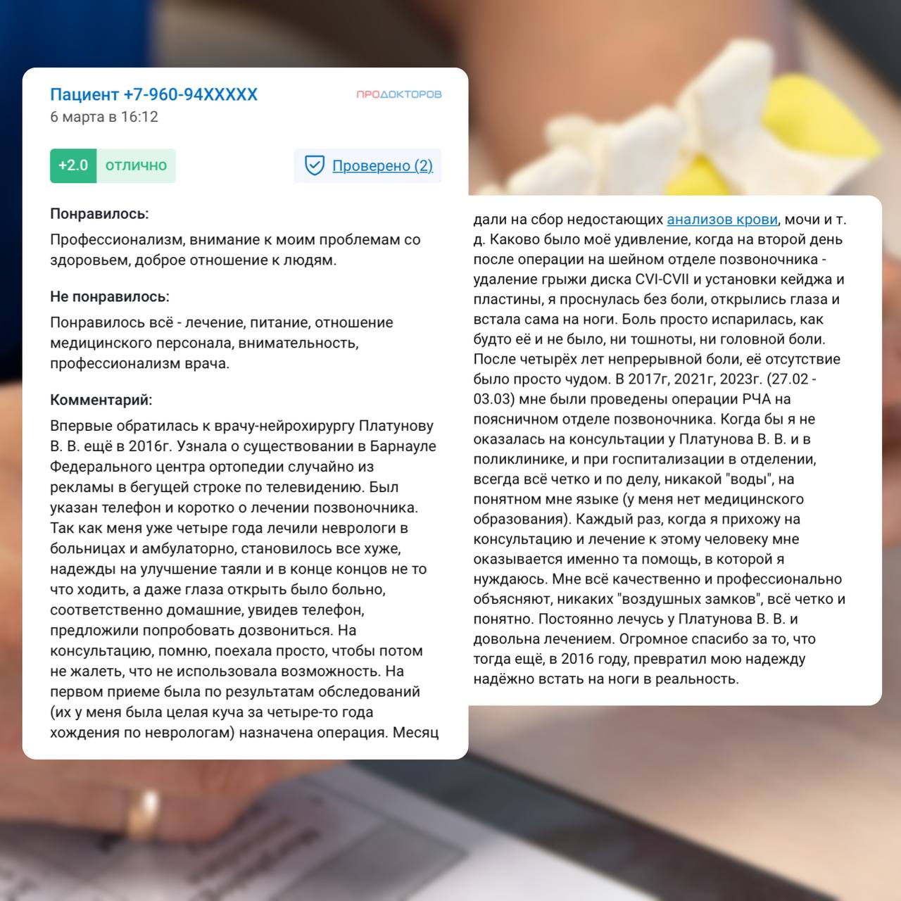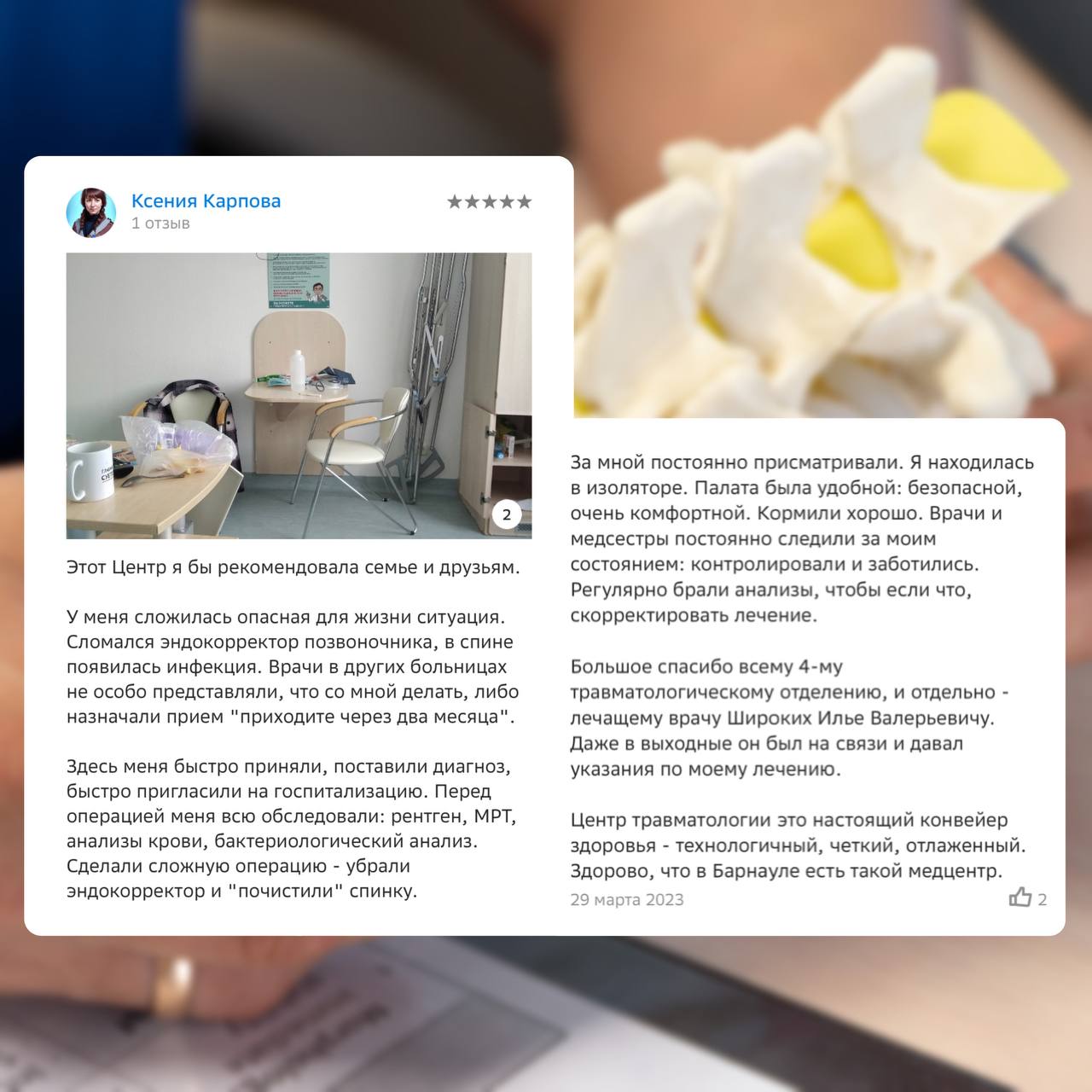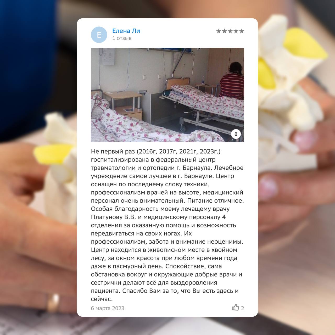 Благодарим вас за высокую оценку работы коллектива «Федерального центра травматологии, ортопедии и эндопротезирования» Минздрава России (г.Барнаул)! Делимся некоторыми отзывами наших пациентов.