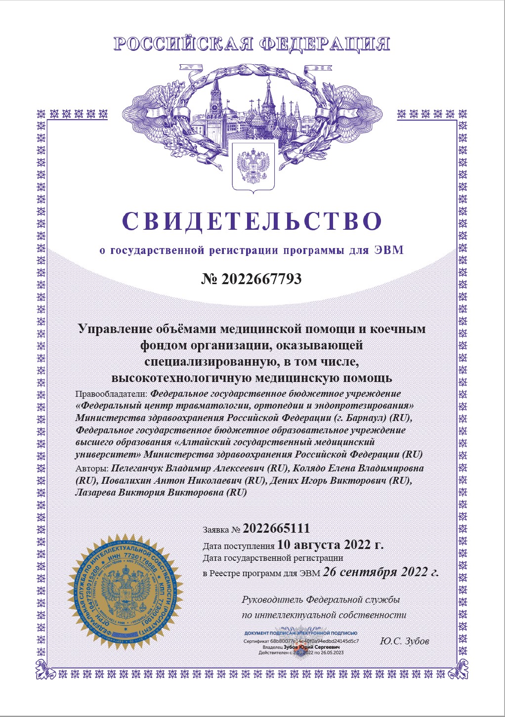 26.09.2022 года в Федеральной службе по интеллектуальной собственности (Роспатент) г. Москва успешно состоялась процедура государственной регистрации программы для ЭВМ «Управление объёмами медицинской помощи и коечным фондом организации, оказывающей специализированную, в том числе, высокотехнологичную медицинскую помощь».