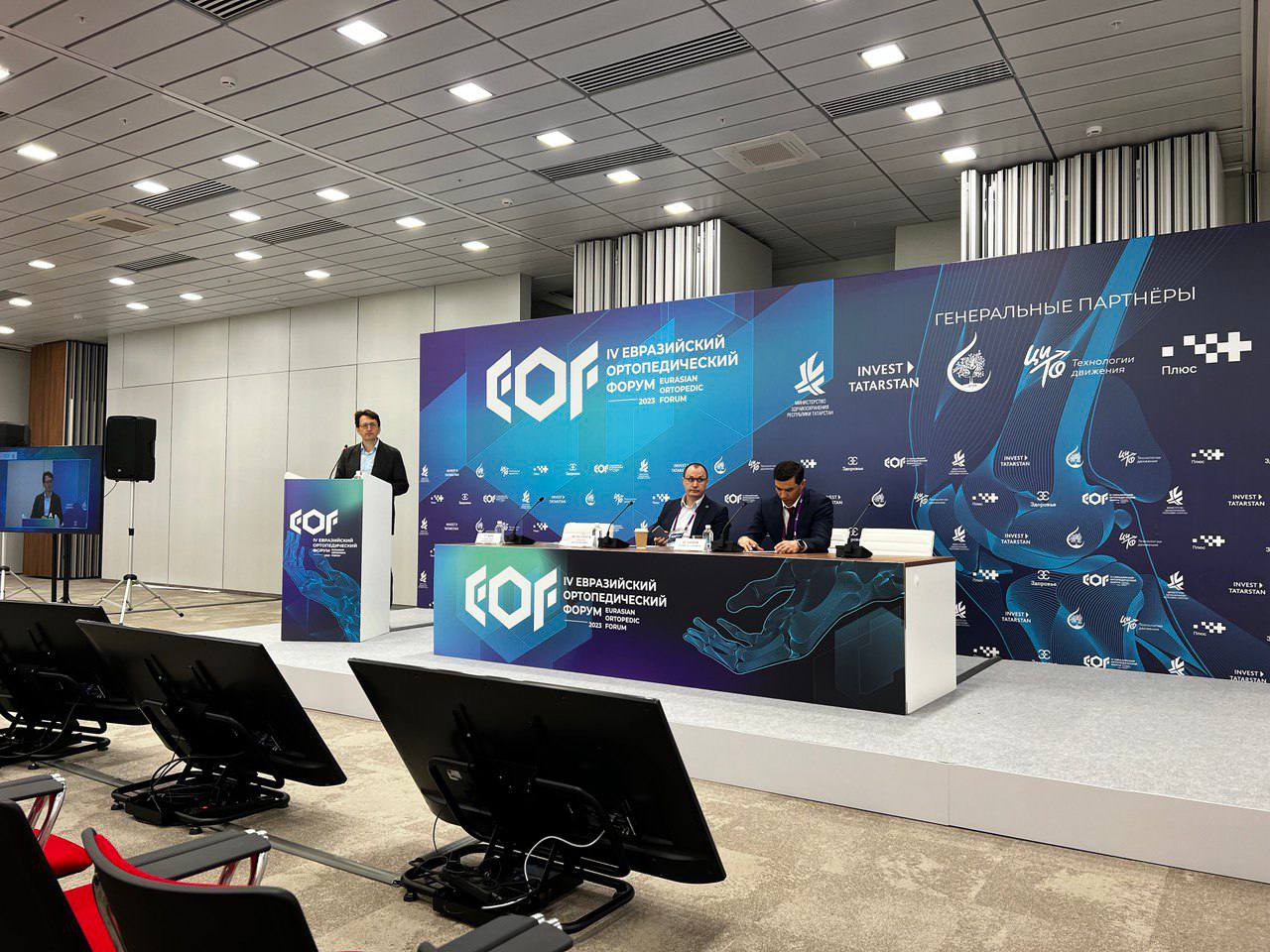 Важнейшим событием Евразийского ортопедического форума стало пленарное заседание «Глобальные вызовы и перспективы развития травматологии и ортопедии», в котором участвовали замминистра здравоохранения РФ Сергей Владимирович Глаголев, замминистра промышленности и торговли РФ Екатерина Геннадьевна Приезжева, министр здравоохранения Республики Татарстан Марсель Мансурович Миннуллин, главный травматолог ДНР Олег Петрович Зерний, главный внештатный специалист травматолог-ортопед департамента здравоохранения Москвы Вадим Эрикович Дубров, а также представители из Индии, Китая, Турции. На заседании обсуждалось импортозамещение в травматологии и ортопедии, обеспечение оборудованием и кадрами в новых регионах России, международное сотрудничество.