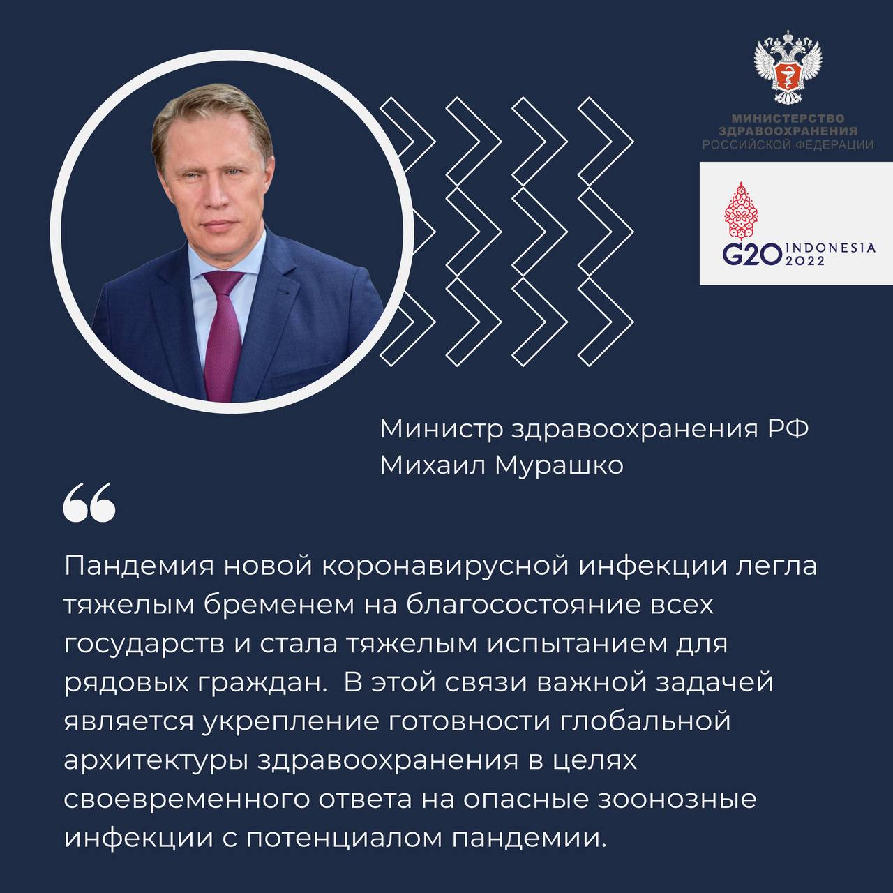 — Пандемия новой коронавирусной инфекции легла тяжелым бременем на благосостояние всех государств и стала тяжелым испытанием для рядовых граждан. В этой связи важной задачей является укрепление готовности глобальной архитектуры здравоохранения в целях своевременного ответа на опасные зоонозные инфекции с потенциалом пандемии, — сказал Михаил Мурашко.