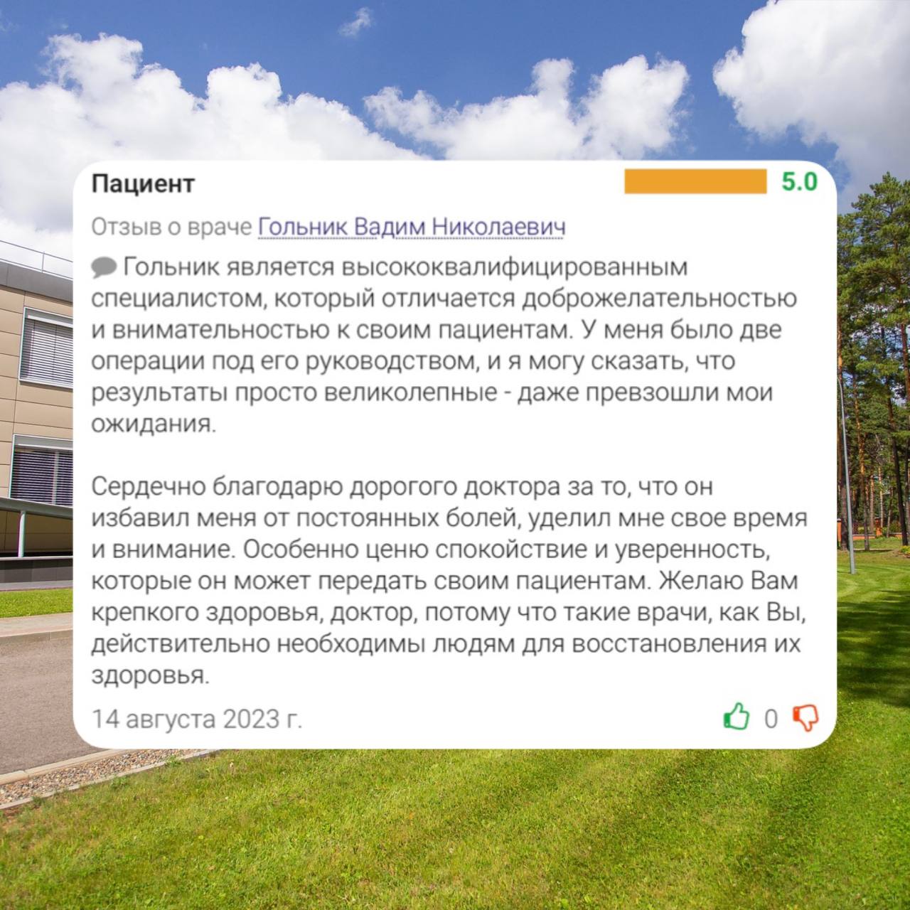 Отзывы наших пациентов - наша гордость. Мы прилагаем все усилия, чтобы обеспечить высокий уровень медицинской помощи и качества реабилитации.