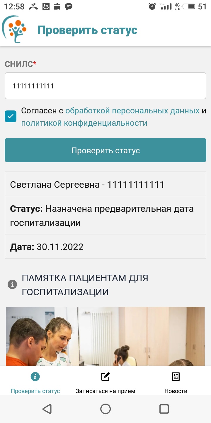 Для вашего удобства разработано мобильное приложение для отображения предварительной даты госпитализации и новостной информации.